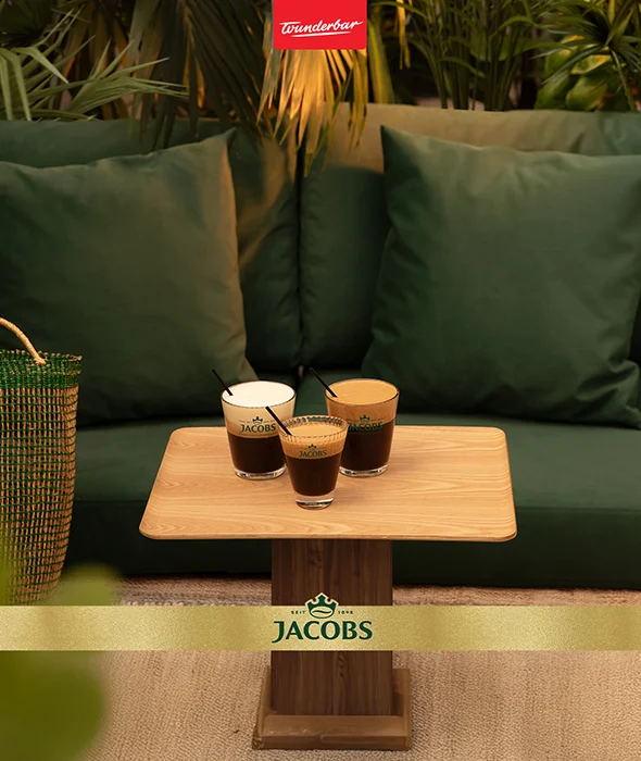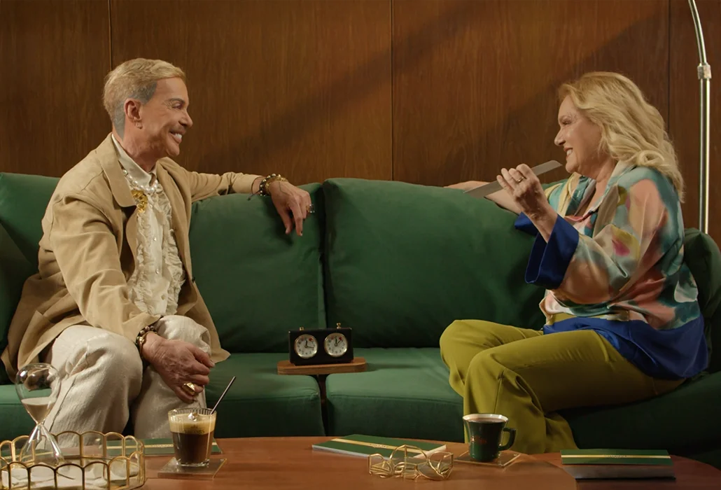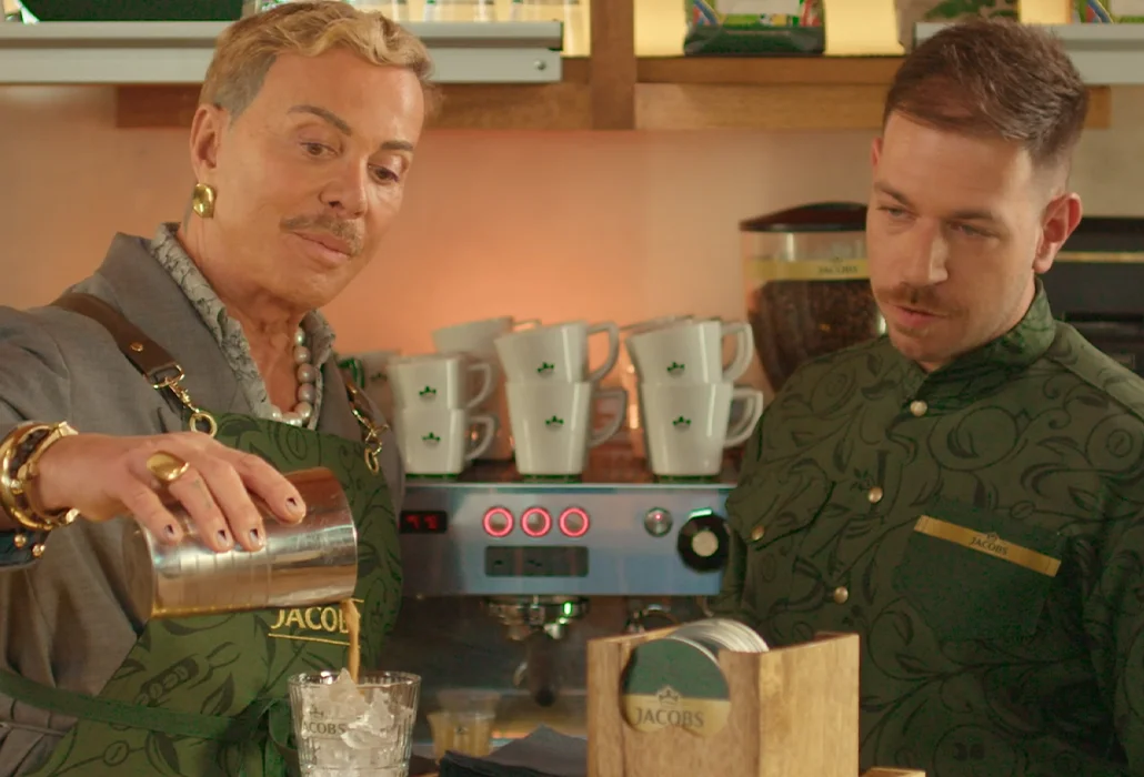 Two personalities from completely different worlds, brought together over a cup of Jacobs on the brand’s iconic green couch.